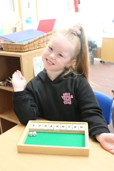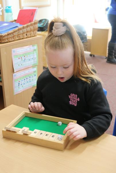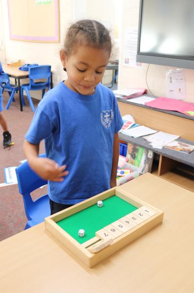 The children in Class 1 put their number-bonds to good use in the dice-rolling game of 'Shut the Box'. Two of our school governors spent time with the children, watching as they tried to win the game by 'shutting down' all the numbers in the box!