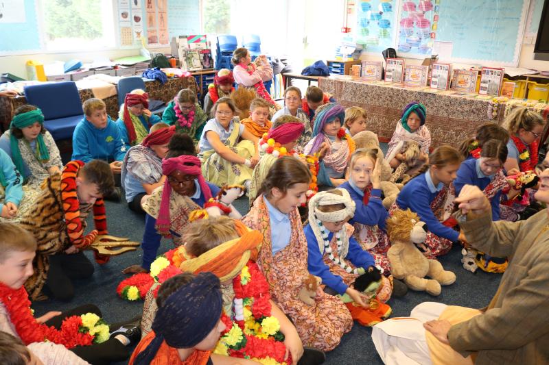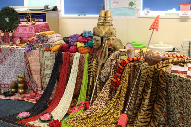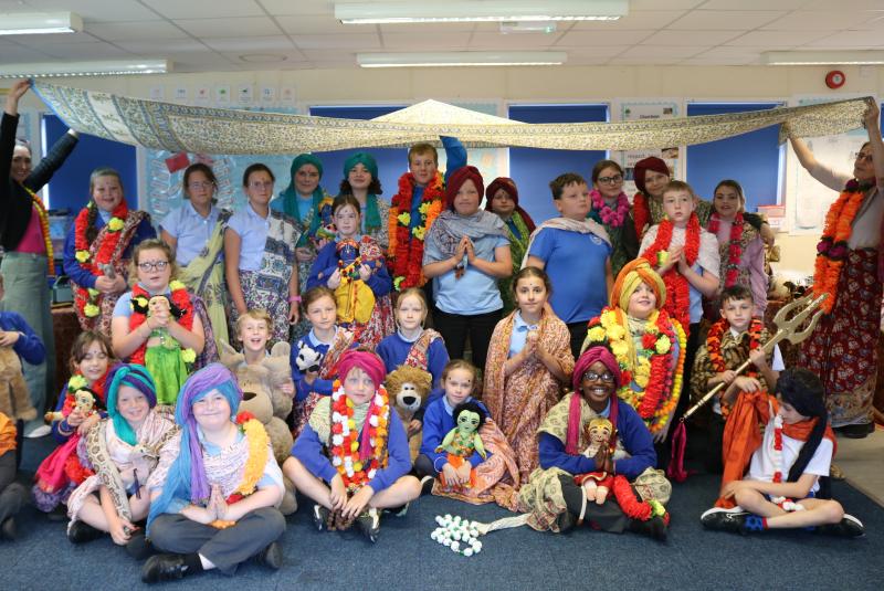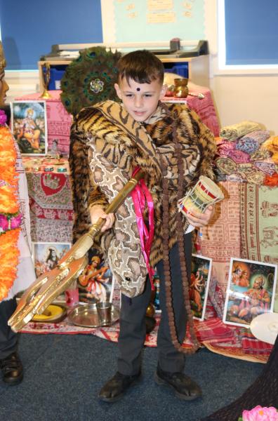 The Hindu guests had worked hard to create an immersive experience for the children, with the classroom decorated and almost unrecognisable beneath beautiful Indian fabrics, colourful garlands of silk flowers, and a temple setting with Hindu Deities including Shiva, Vishnu, Ganesha and Lakshmi.